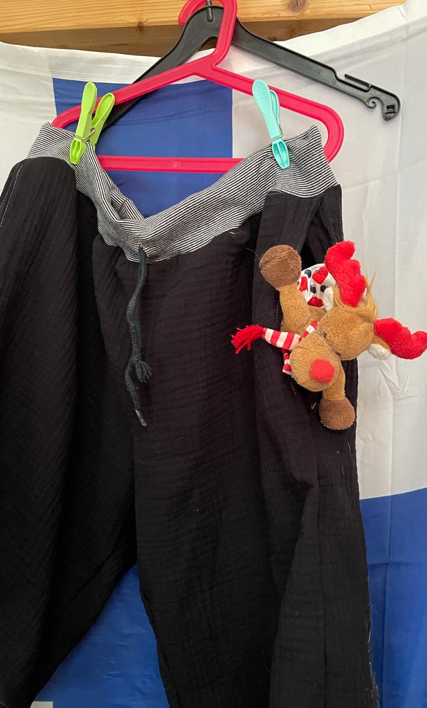 Der Bund der Hose kann enger als das Schnittmuster das vorgibt. Weil die erste Variante von den Hüften fiel, habe ich per Hand eine Art Knopfloch genäht und dann Gummiband eingezogen!