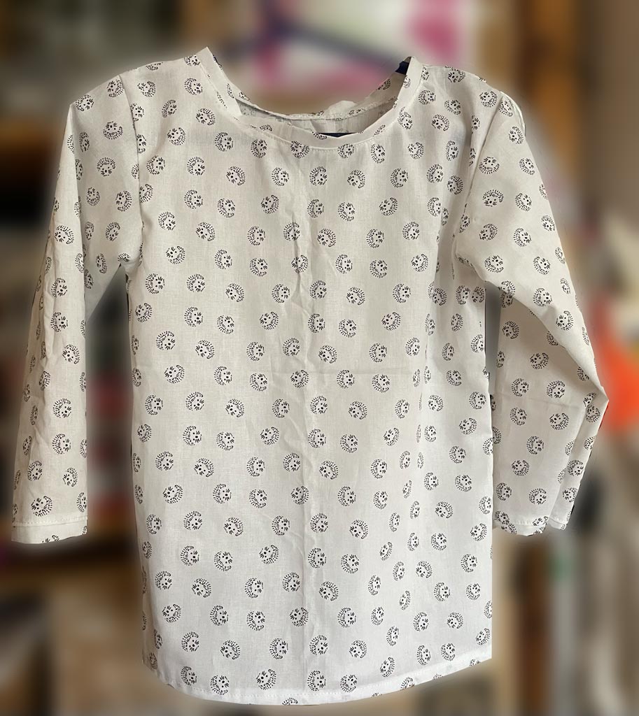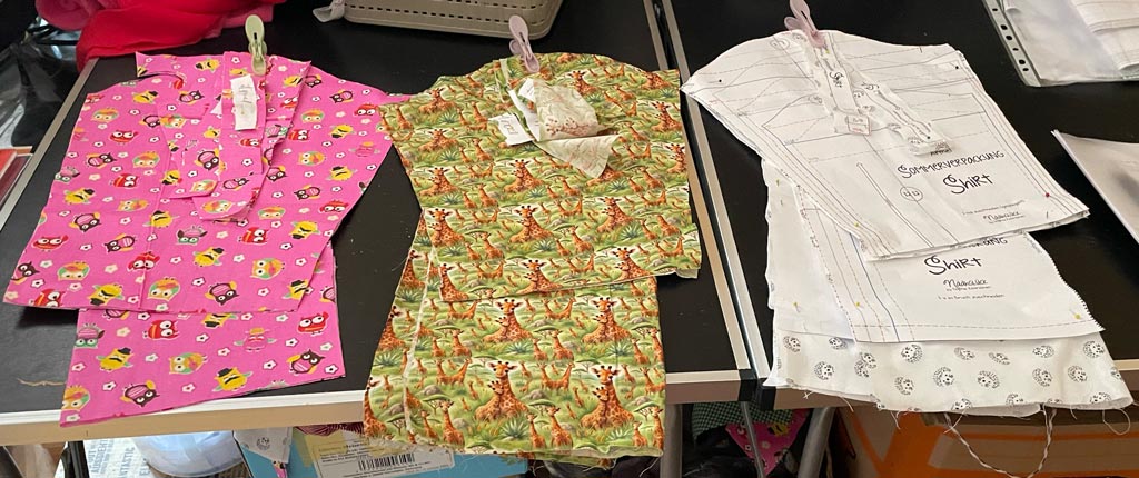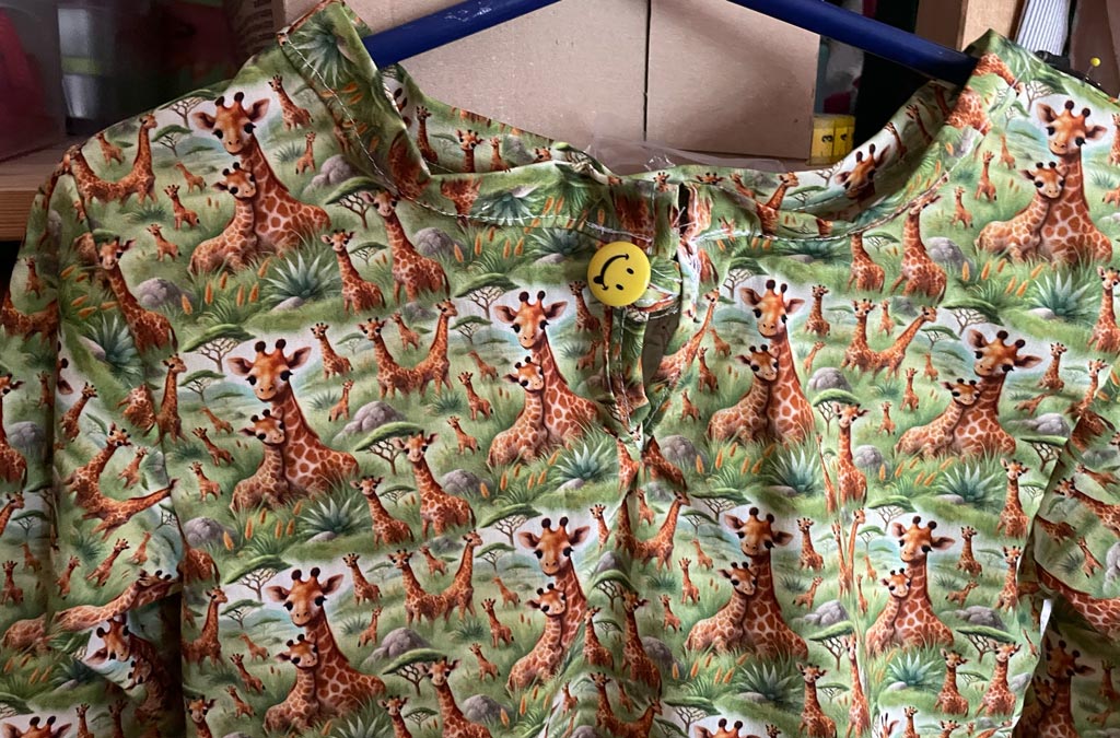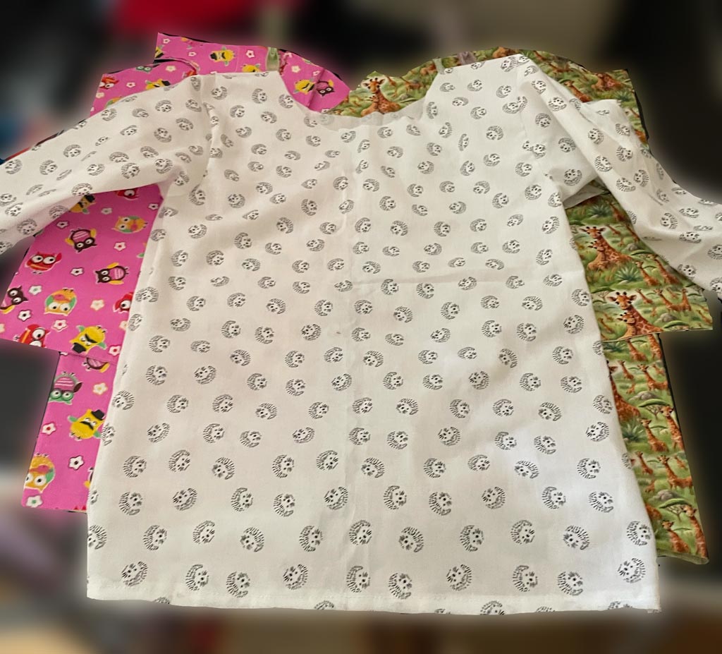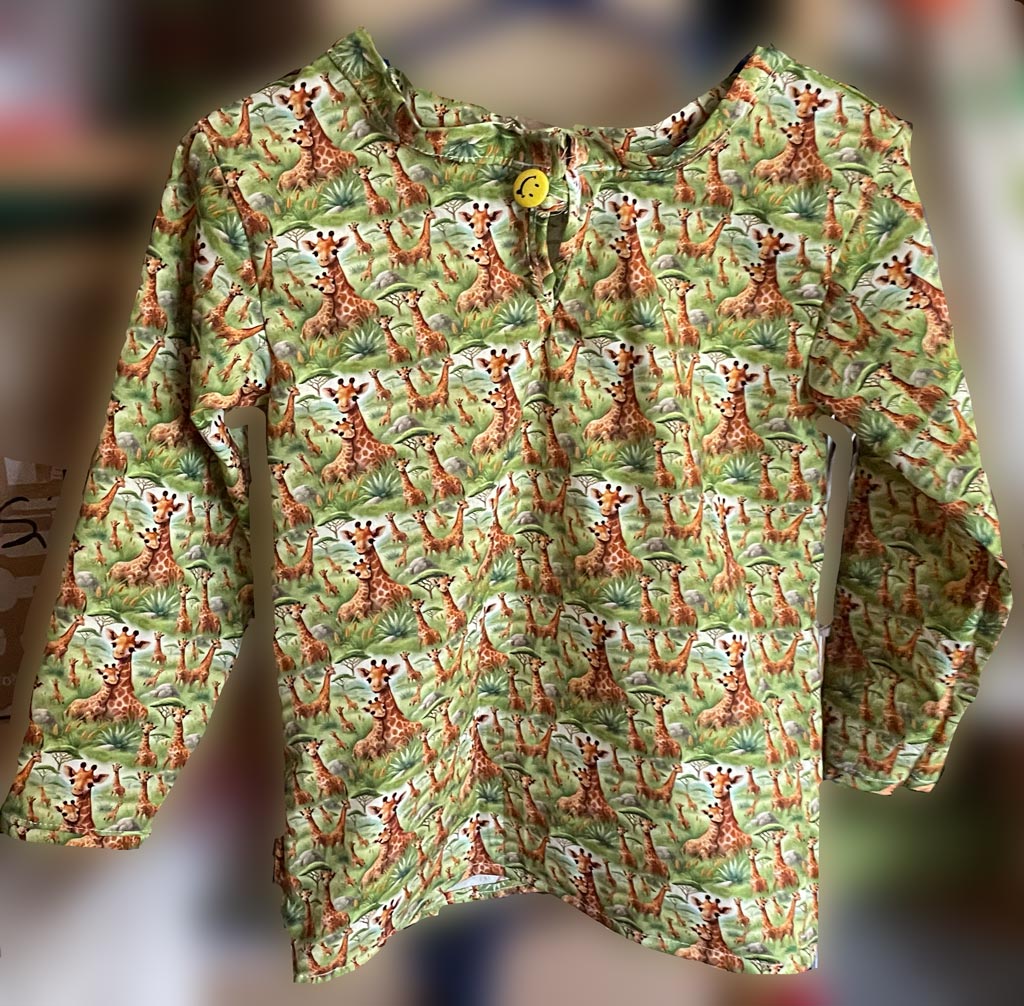 Hier habe ich ein paar aus Stoffen genäht, die die Oma des befreundeten Kleinkindes angeschleppt hat: karriert, mit Giraffen und kleinen Igeln.